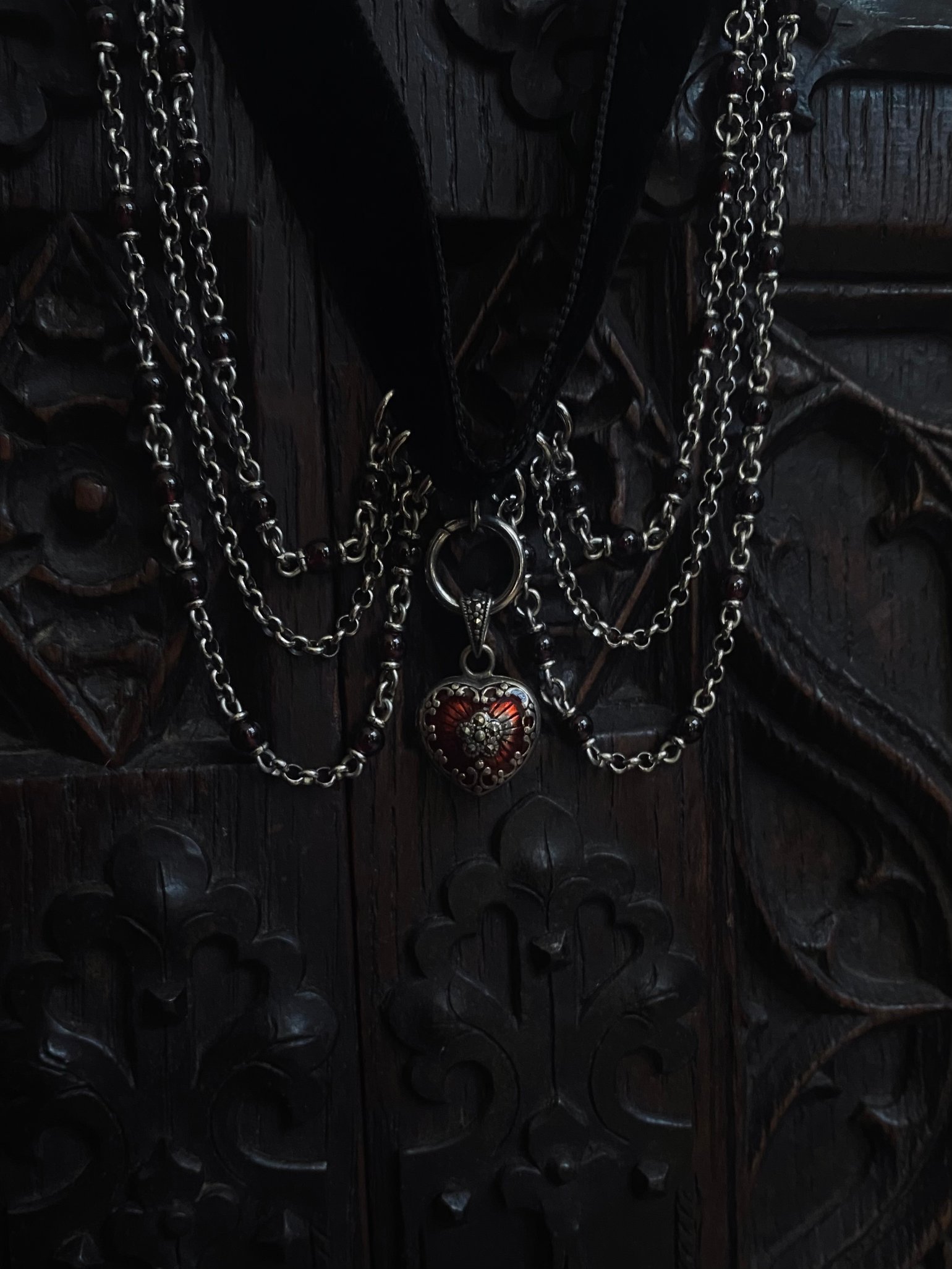 velvet ribbon, all stainless steel and garnet beads with a sterling silver locket. 14.5" long including the ~2" extender