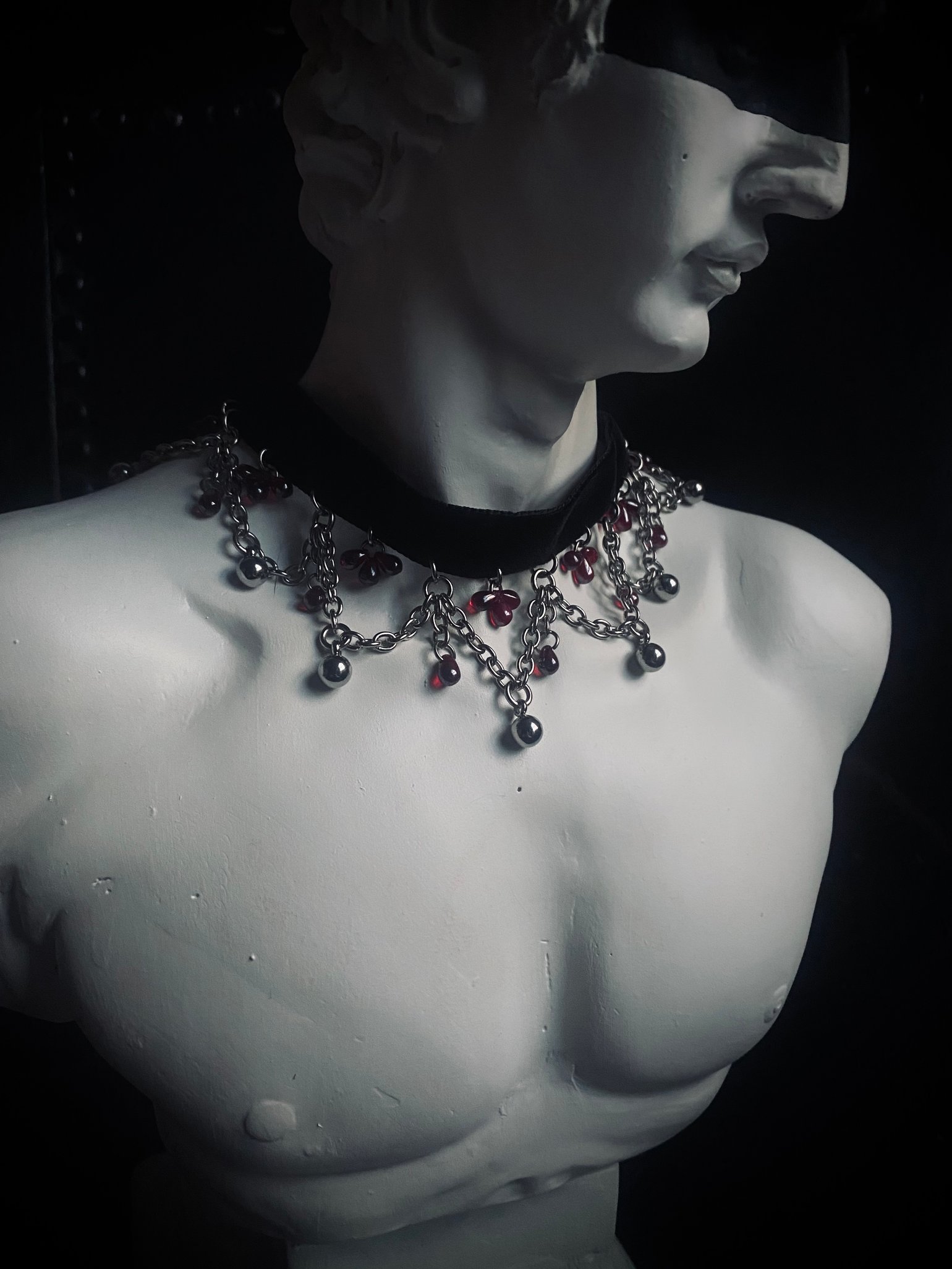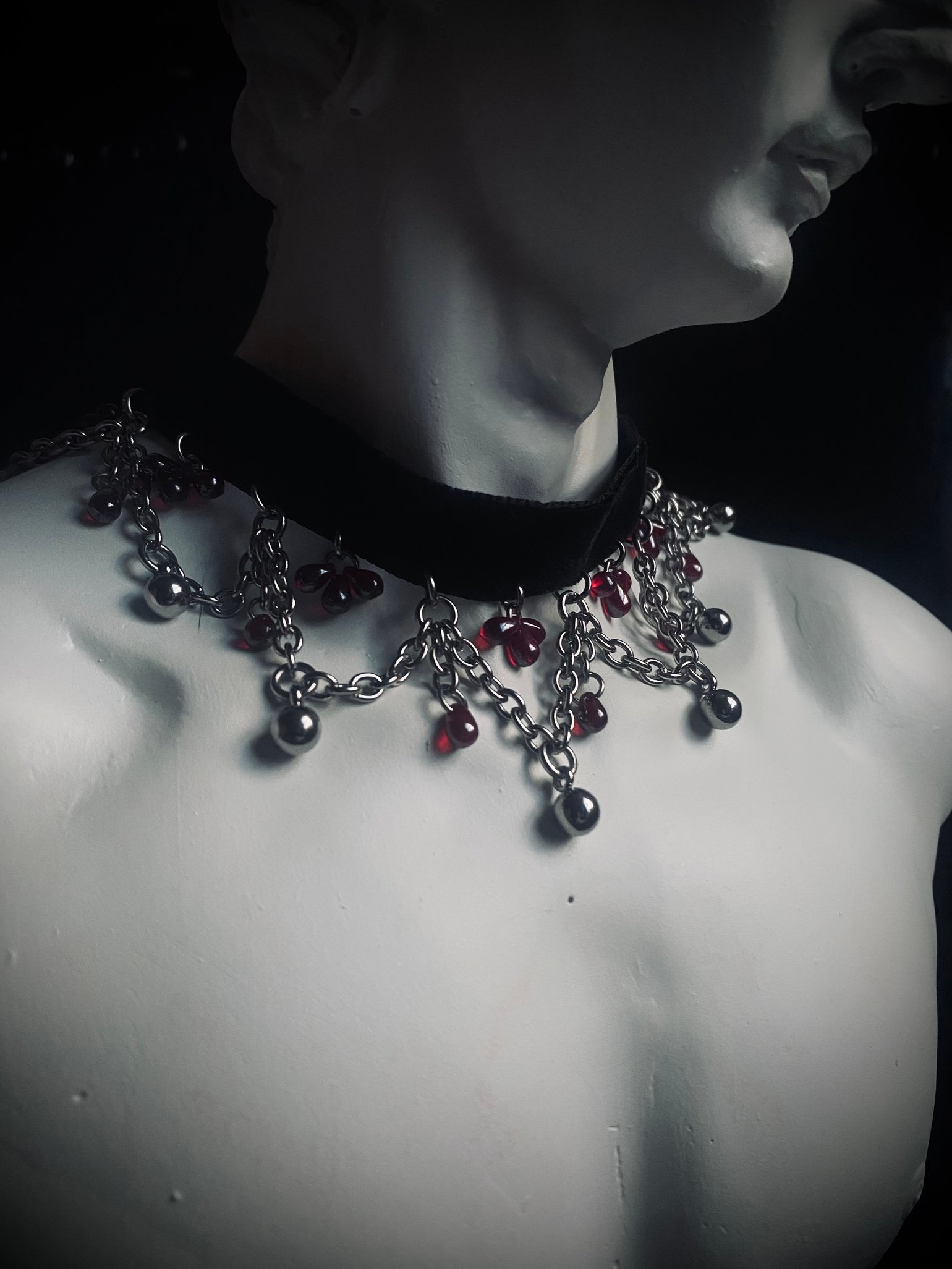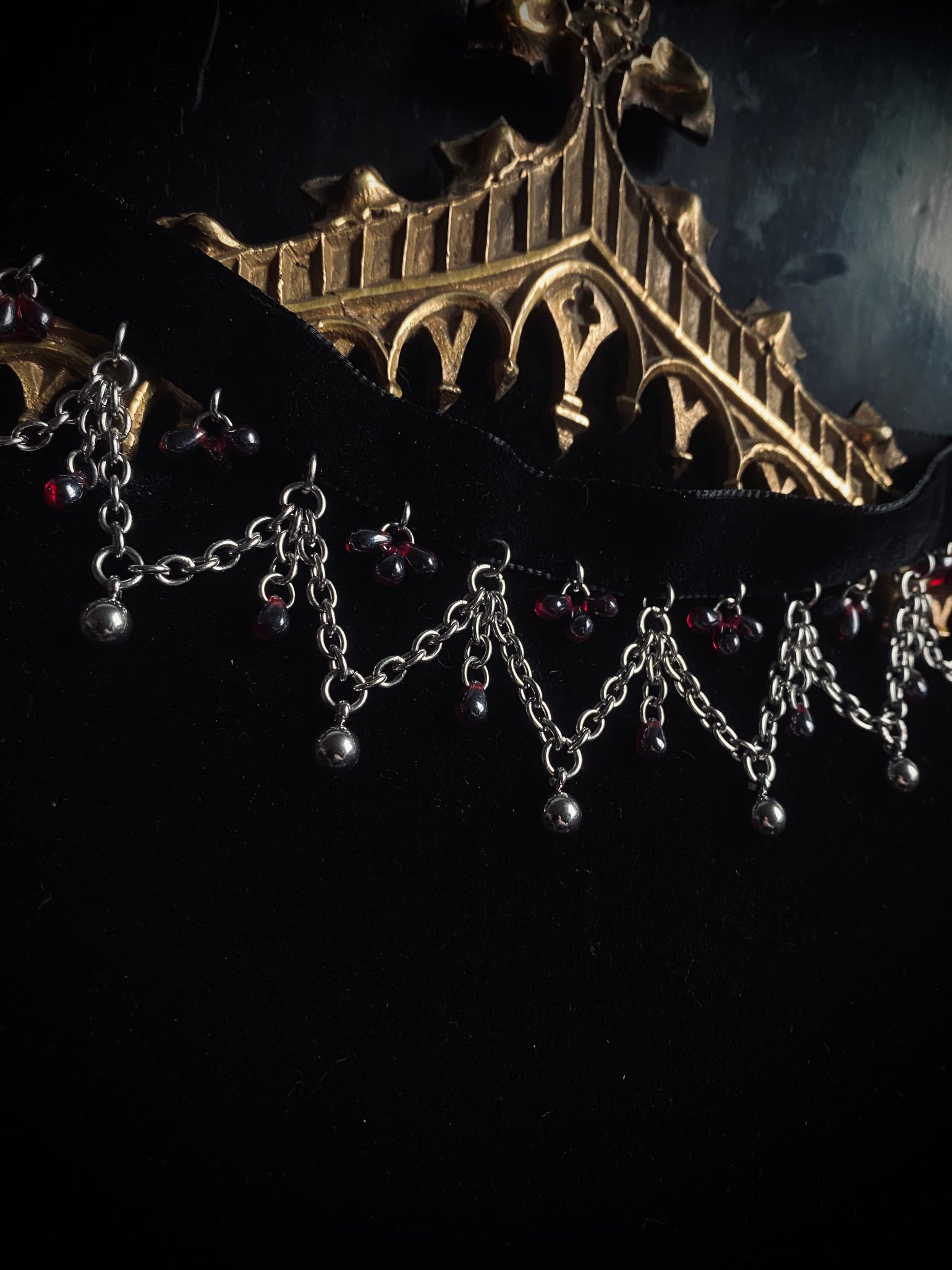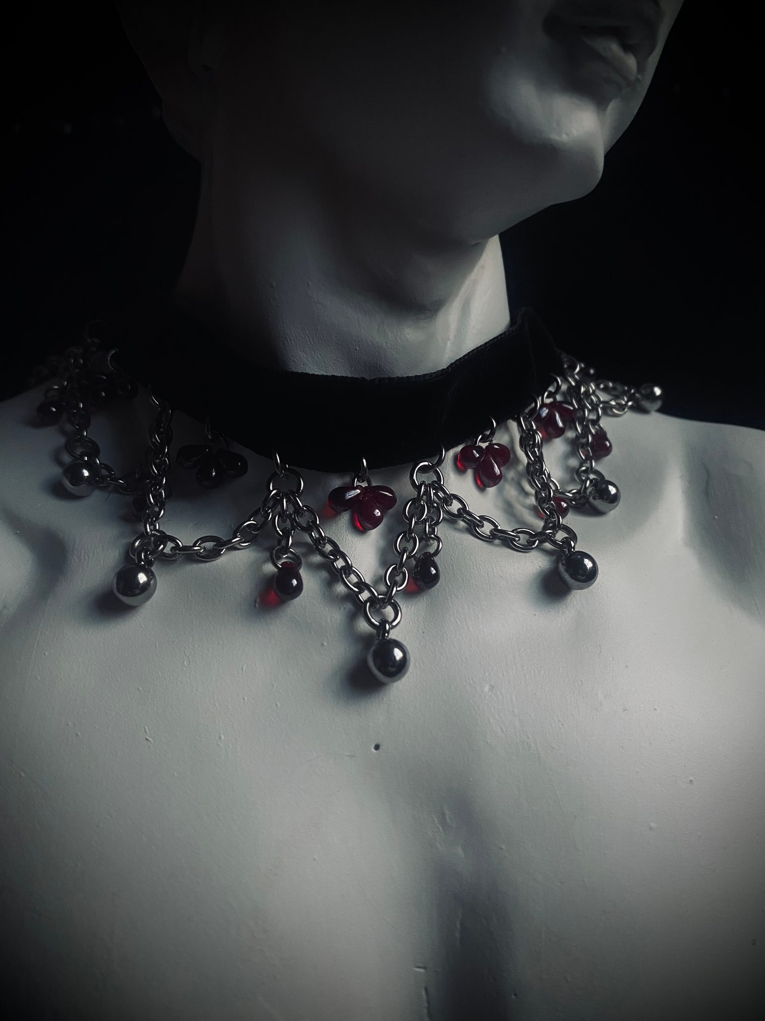 inspired by medieval florals, from this velvet choker hang stainless steel chains and satisfyingly weighty ball charms, with red glass charms spaced between.