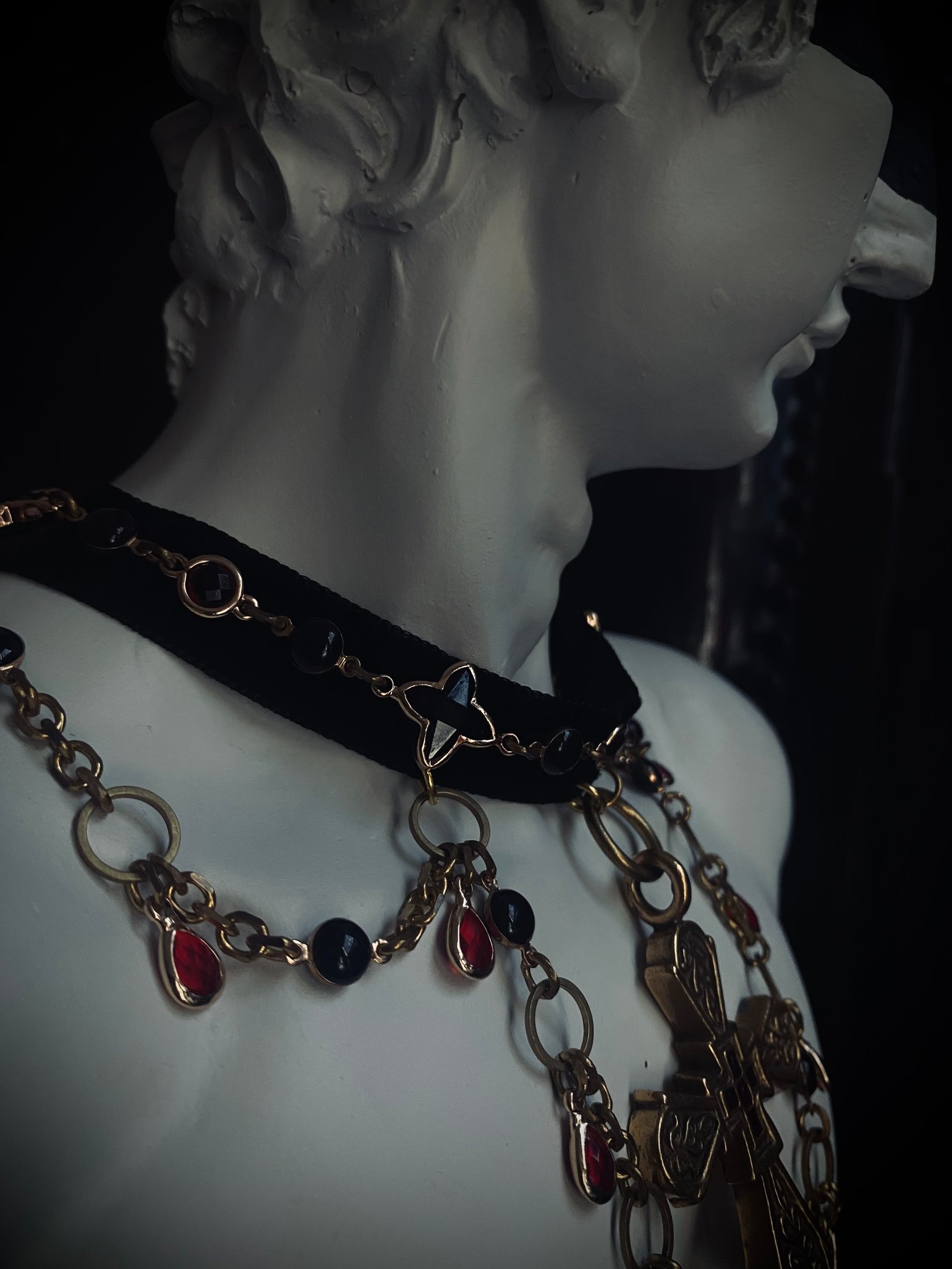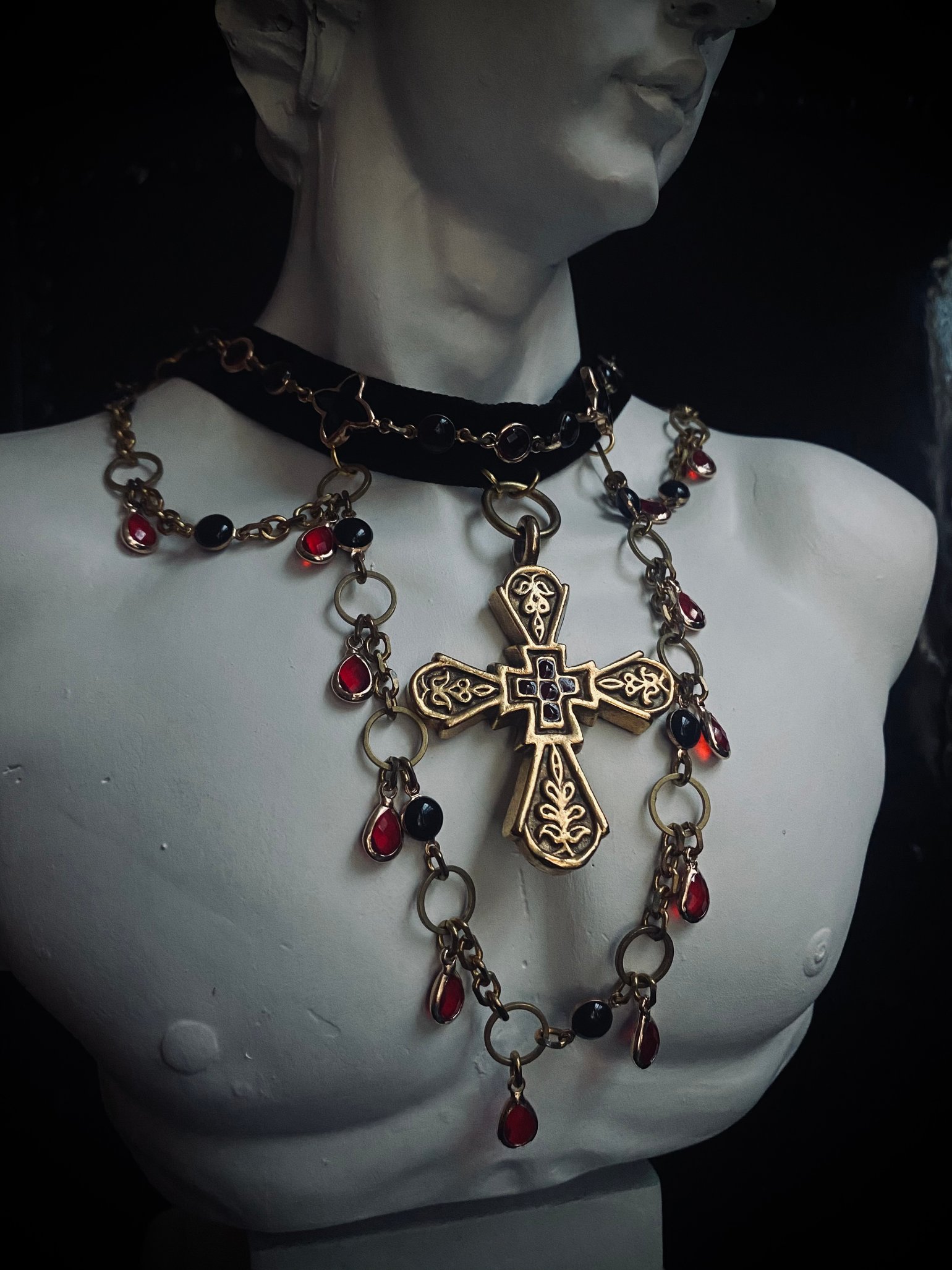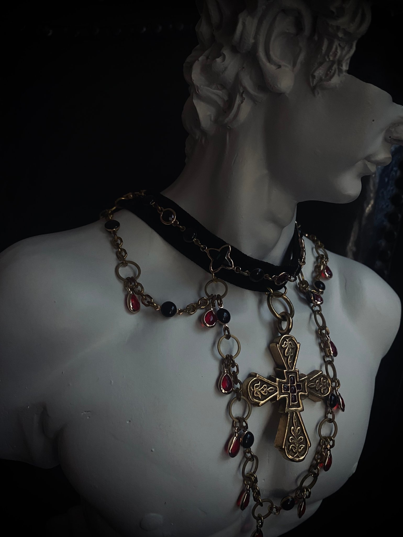 for the dramatic and discerning clergy, from this velvet choker hangs a strand of brass charms, red glass faceted drops, black enamel beads, and a vintage brass cross with medieval vibes. a chain of red and teal glass charms and black enamel beads has been hand stitched across the velvet. 15.5" long including the 3" extender, the cross pendant is 2.25" long.