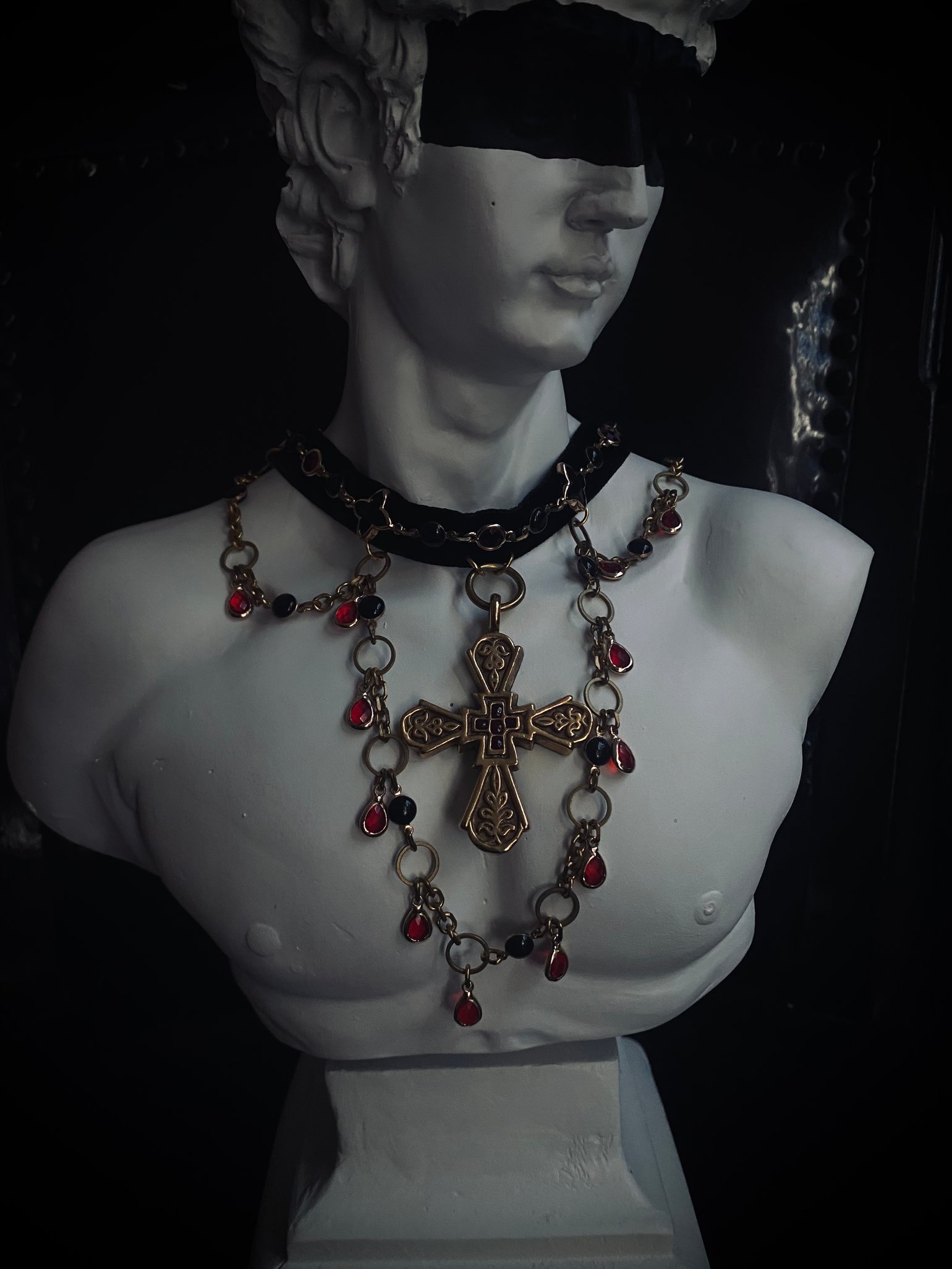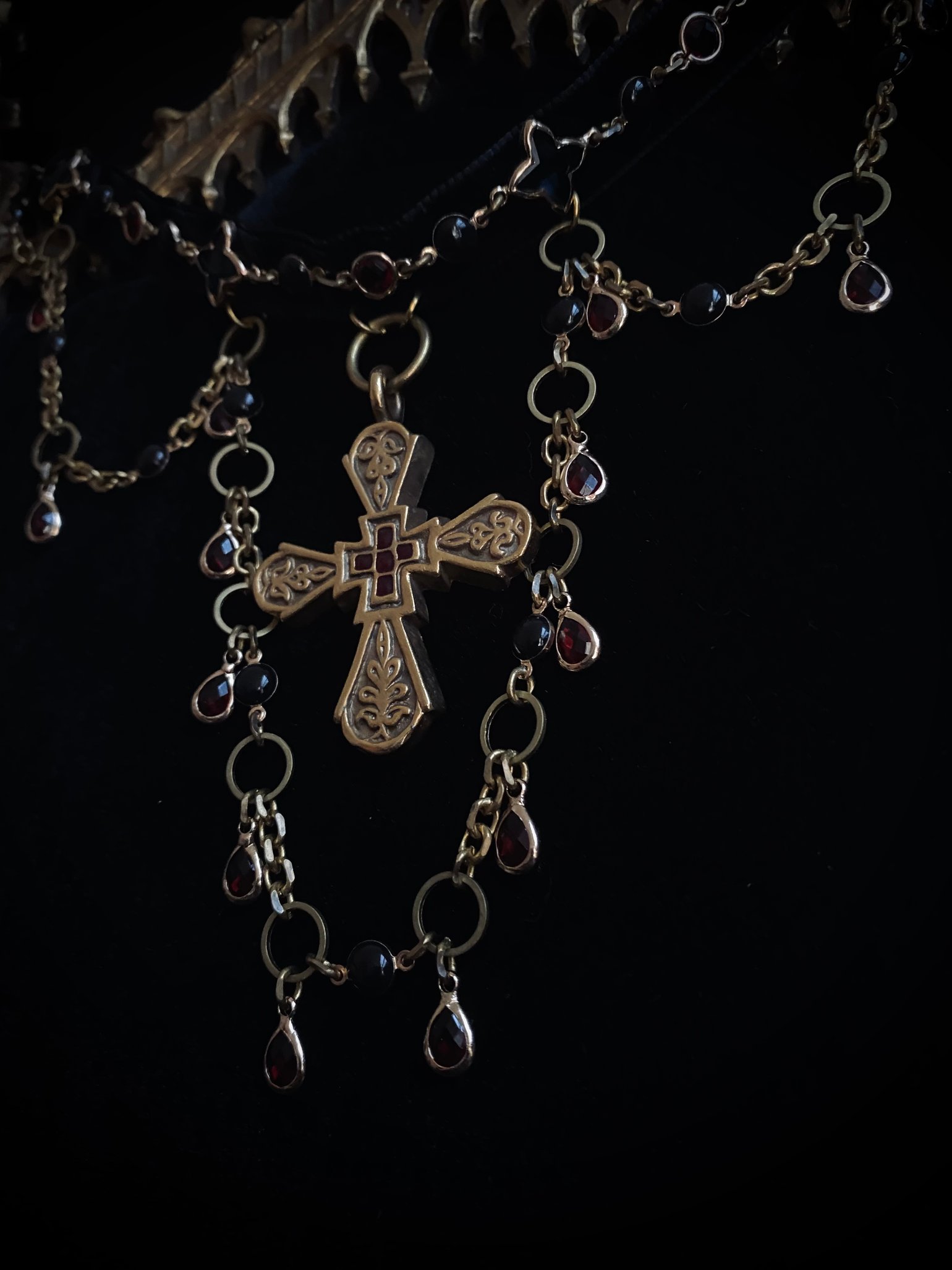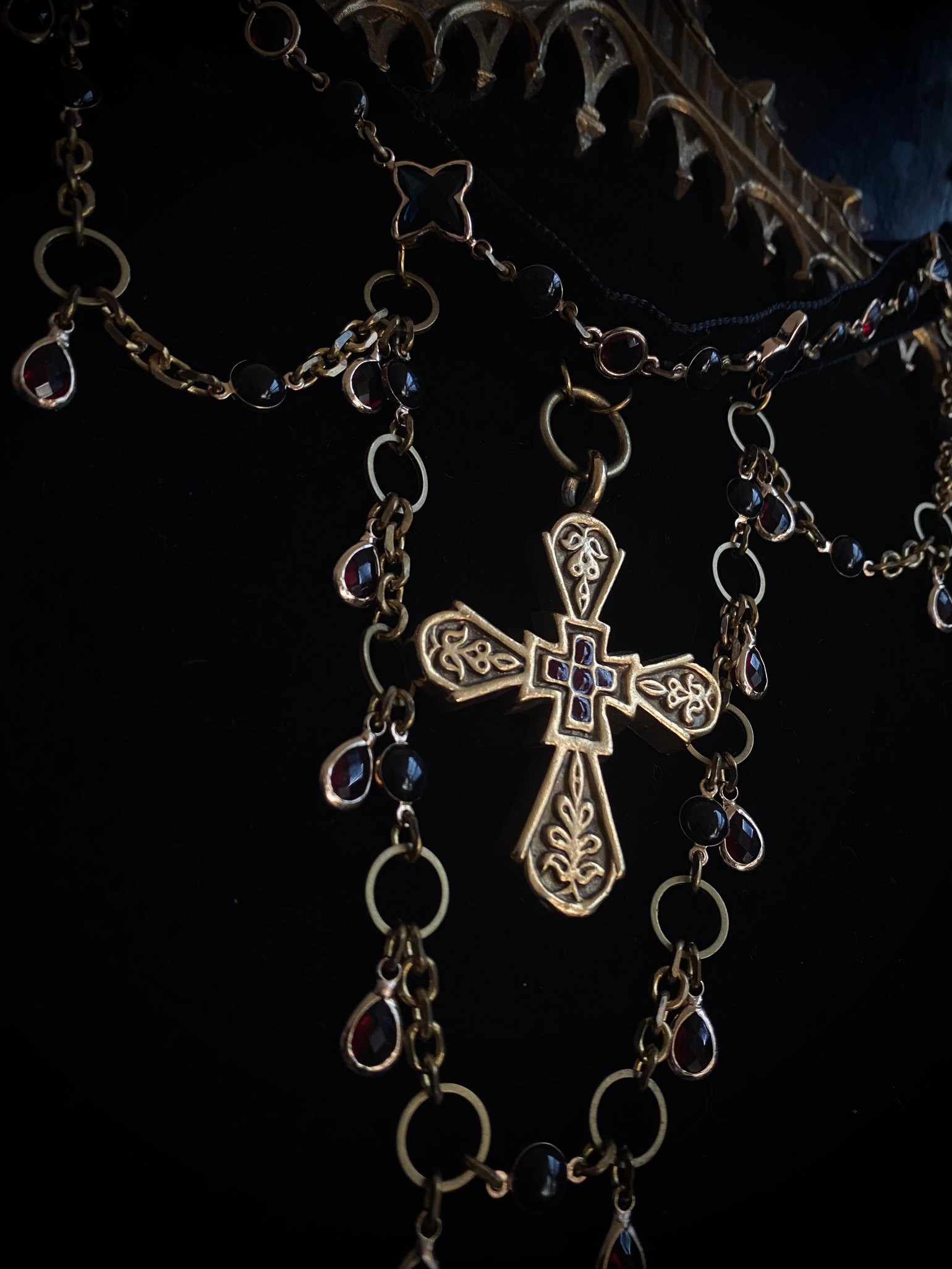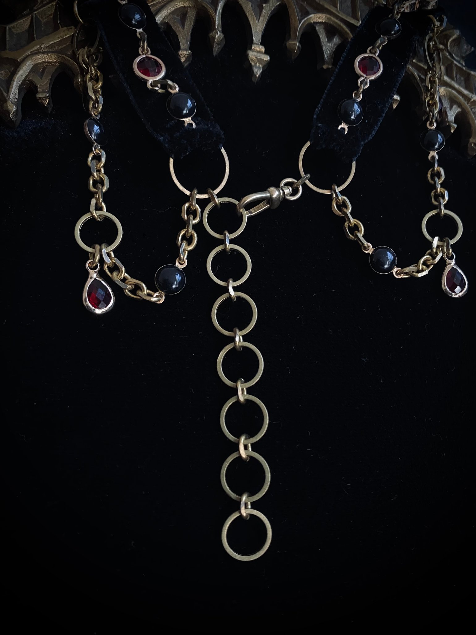 for the dramatic and discerning clergy, from this velvet choker hangs a strand of brass charms, red glass faceted drops, black enamel beads, and a vintage brass cross with medieval vibes. a chain of red and teal glass charms and black enamel beads has been hand stitched across the velvet. 15.5" long including the 3" extender, the cross pendant is 2.25" long.