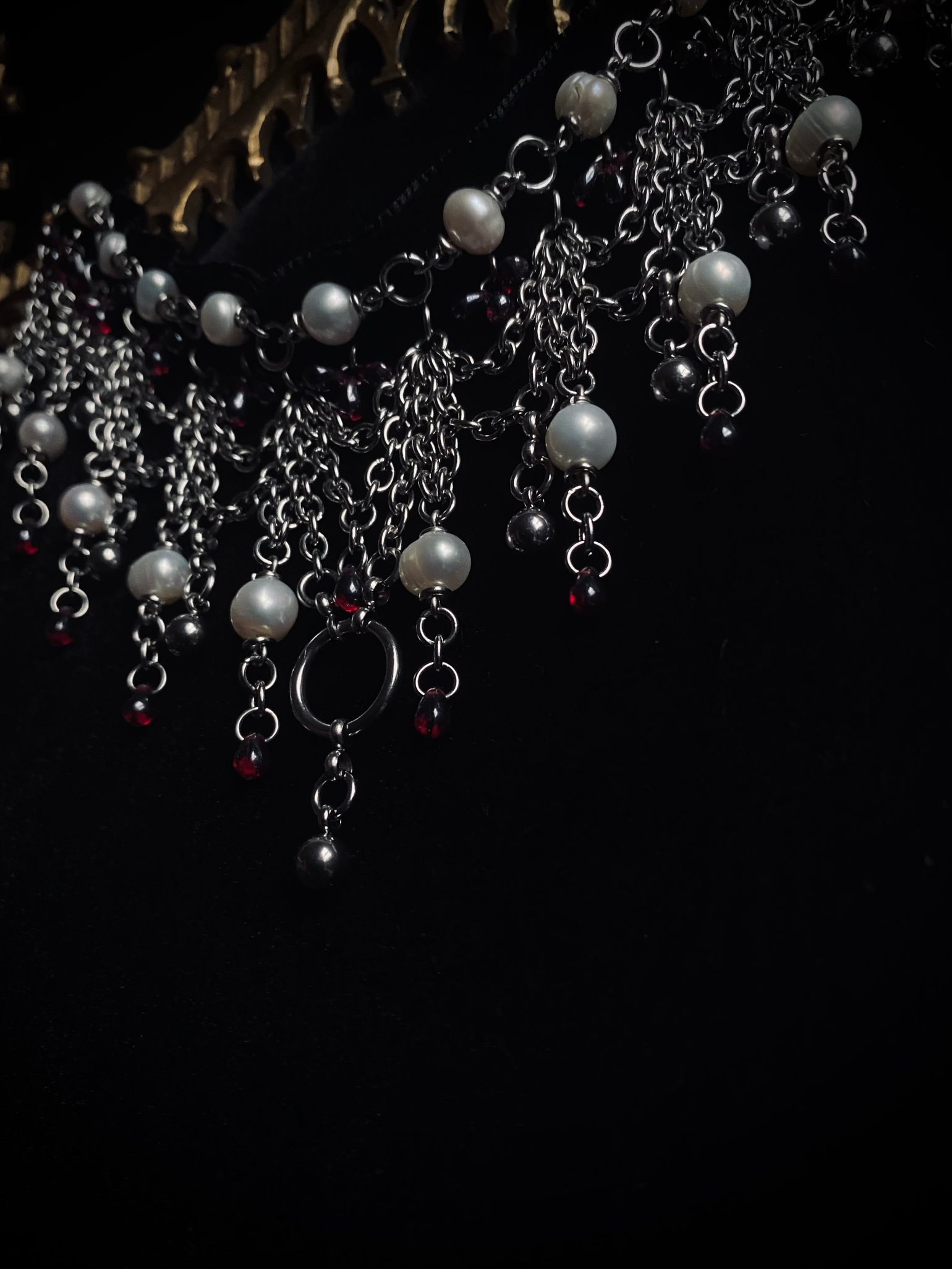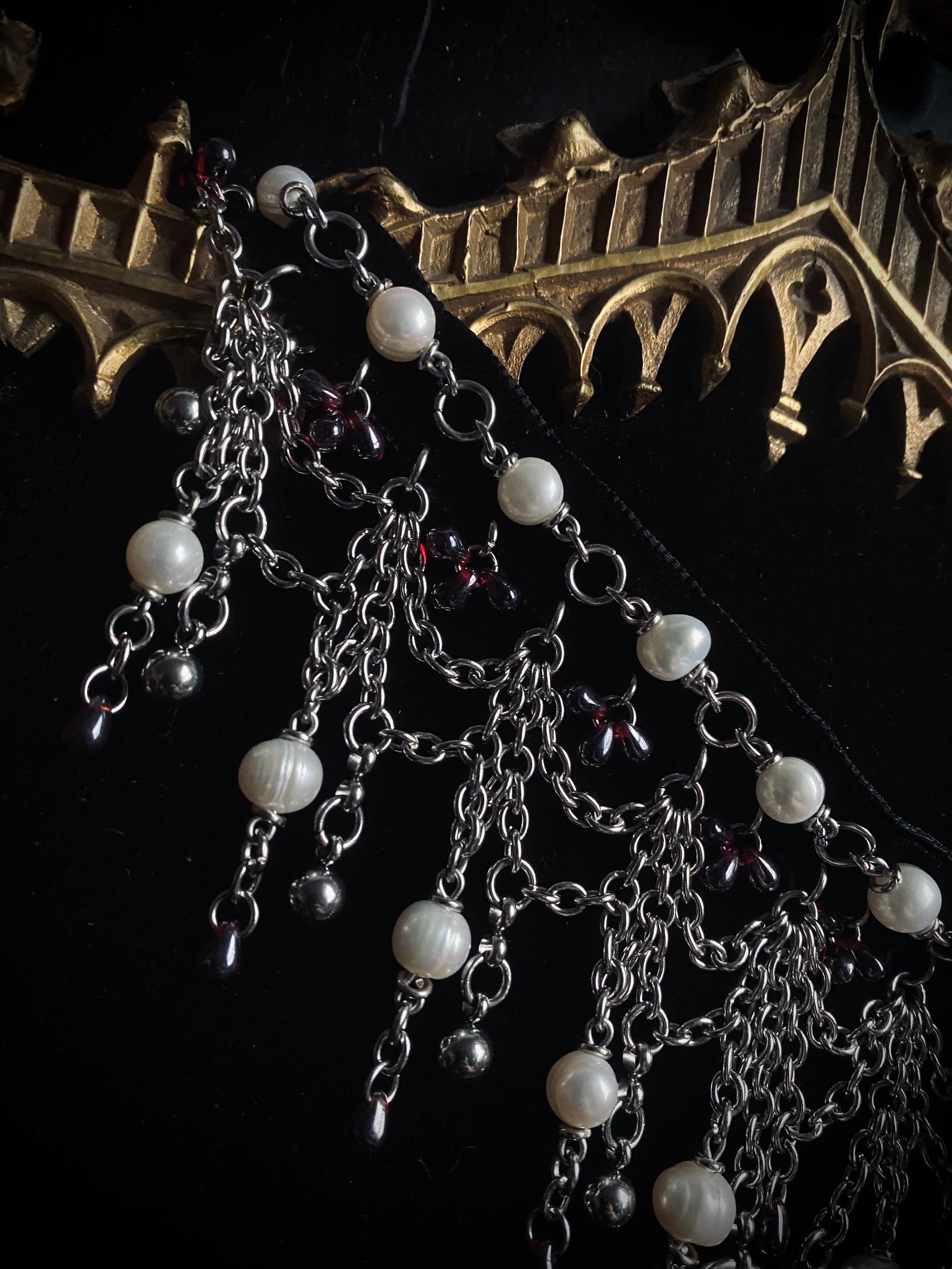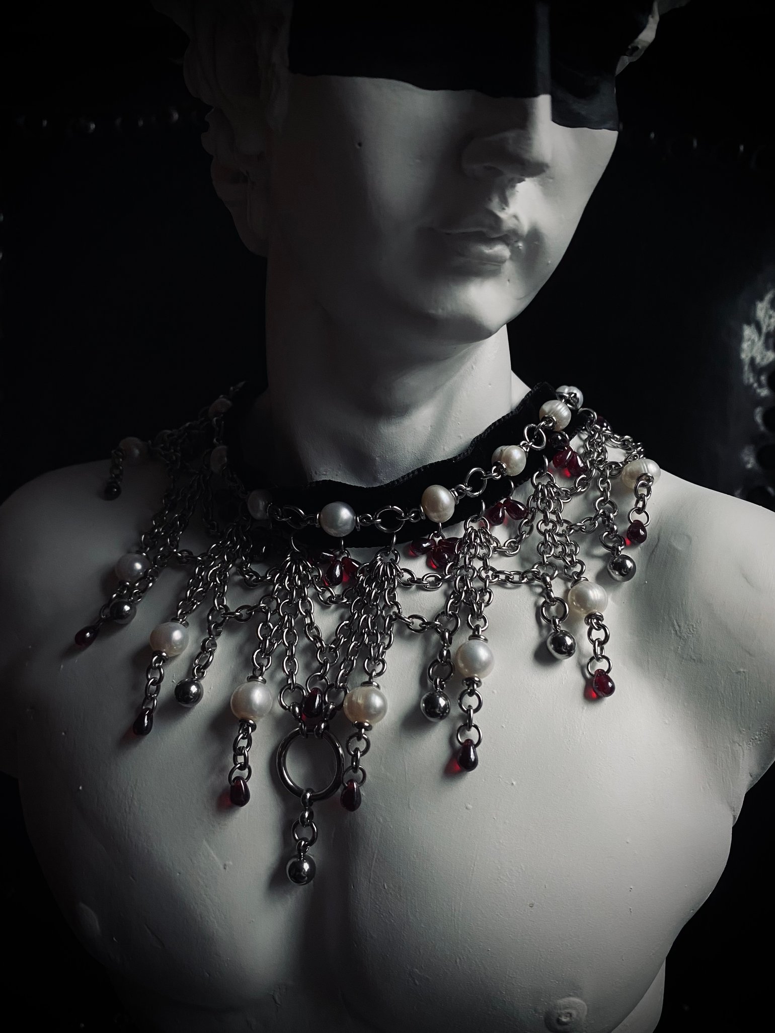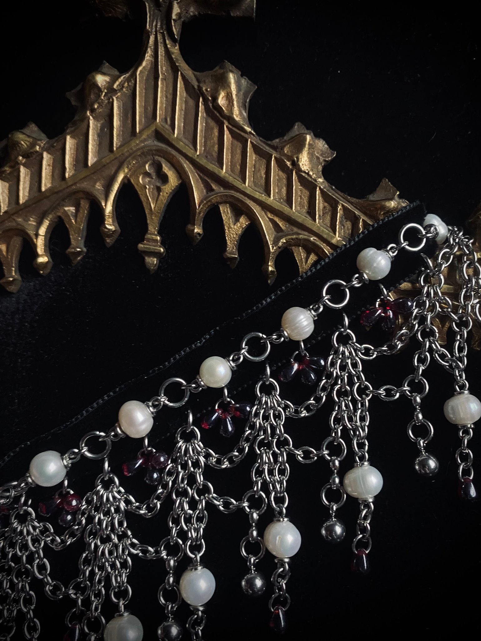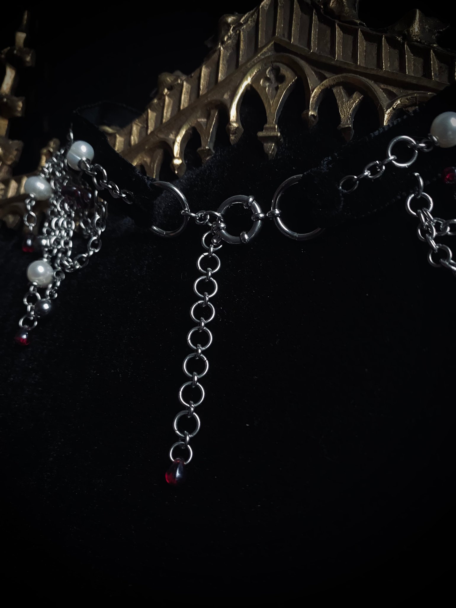 inspired by medieval florals, from this velvet choker hang stainless steel chains and satisfyingly weighty ball charms, freshwater pearls wired by hand, with red glass charms spaced between and a stainless steel o ring serving as a pendant. 14" long including the 2" extender, this choker is for the lover of old world fairy tales with a modern edge 🩸