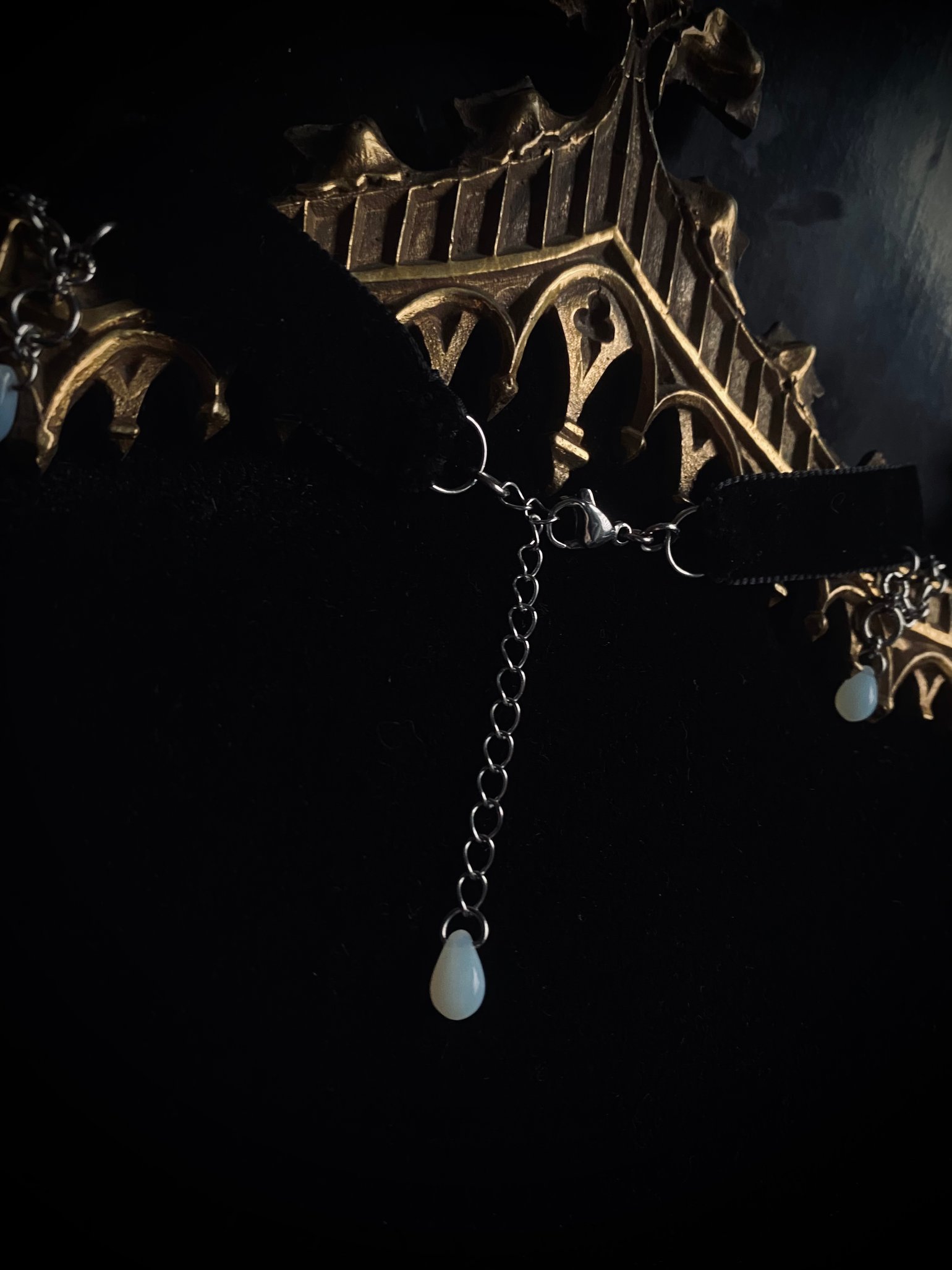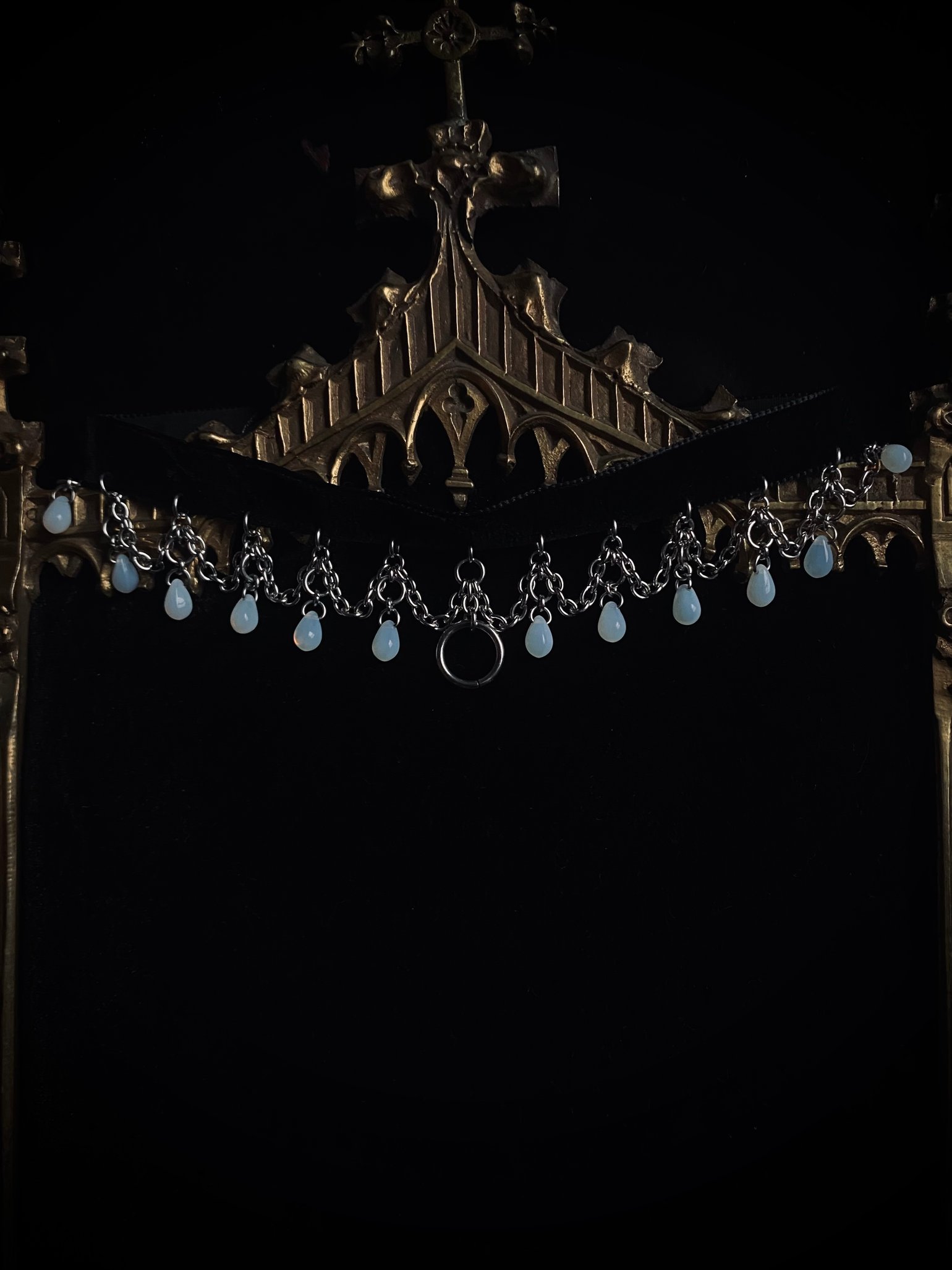 from this velvet choker hang stainless steel chains, a stainless O ring, and opalite glass charms spaced between. 14" long including the 2" extender.